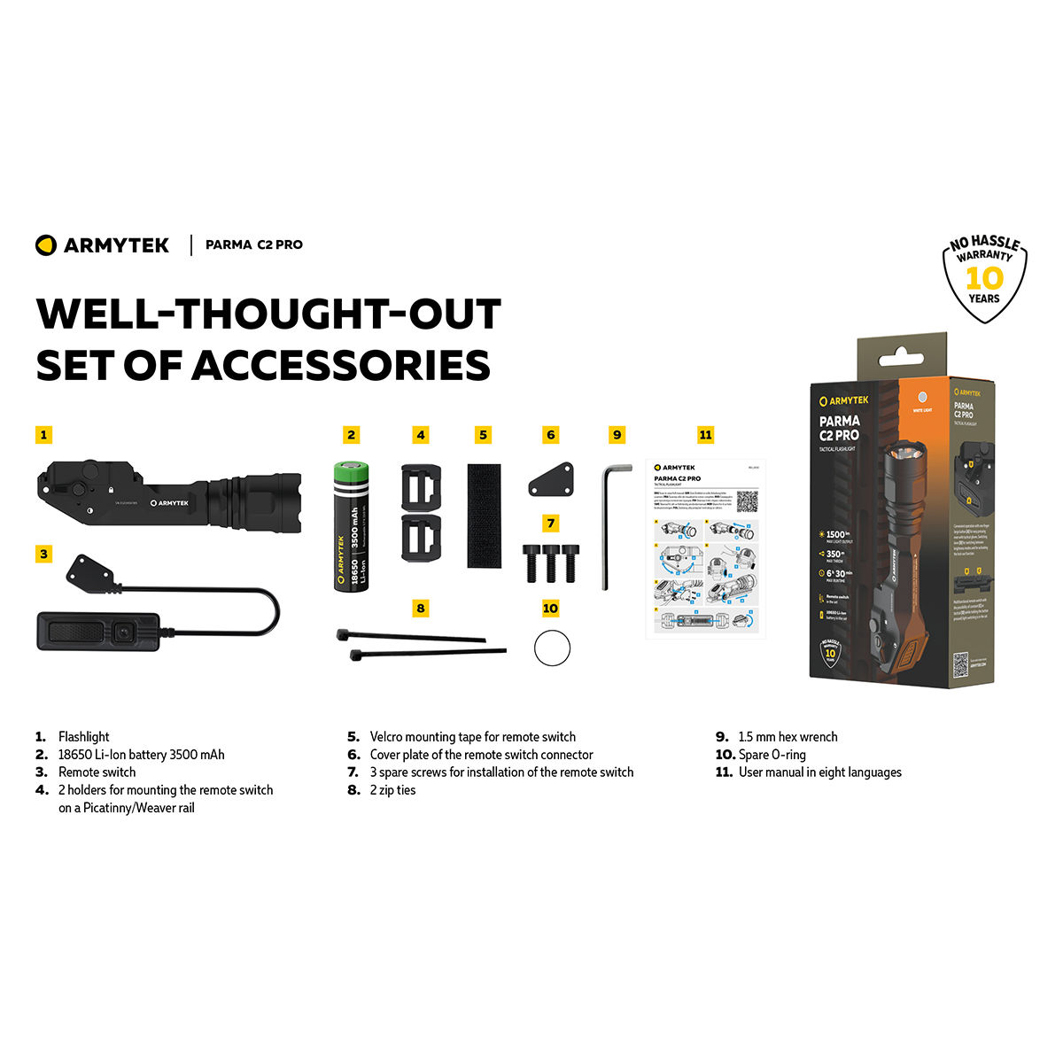 Parma C2 Pro är en taktiskt lampa med integrerat vapenfäste. Fungerar lika bra till taktiskt tillämpning som för eftersök. Du får en ljusstyrka på 1500 lumens och en räckvidd på 350m i ett slimmat utförande på vapnet.
