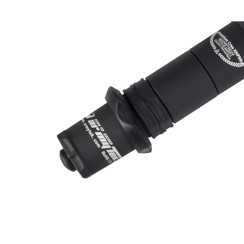 2.) För att nå övriga ljuslägen så lossas lamphuvudet 1/8 dels varv i avstängt läge. Tryck sedan in strömbrytaren halvvägs, för varje gång strömbrytaren trycks in halvvägs så växlar lampan mellan övriga 8 lägen (ej full ljusstyrka som bara nås med fullt åtskruvat lamphuvud). När du har hittat det ljusläge som ger önskad mängd ljus kan strömbrytaren tryckas in fullt. Armytek har sedan ett inbyggt minne som kommer ihåg senaste valda läge om lampan stängs av och återigen sätts på.