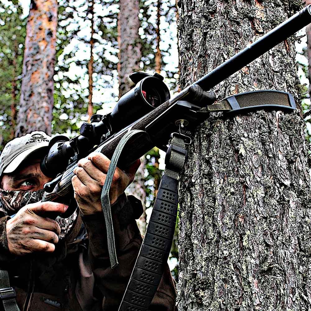 Tack vare en smart platta under förstocken som monteras i befintligt rembygelfäste så kan en extra rem dras runt en trädstam och sedan fästa i plattan och på så vis använda trädet som skjutstöd.